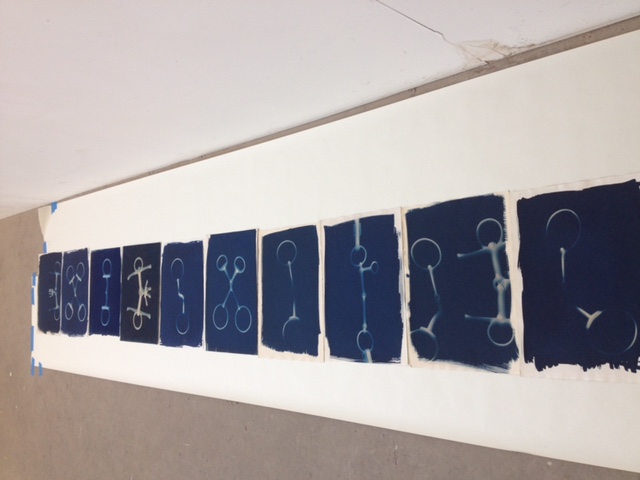 In Knight's cyanotypes the joints, rings and shanks of the metal horse bit create enigmatic forms that allude to an arcane language. The bit at it’s most rudimentary is a way to communicate direction and speed, but at the more advanced equestrian levels the bit can harness the horse's energy and rhythm for the more complex dressage movements.